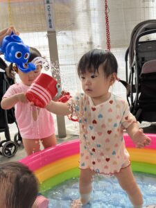 水遊びを始めたばかりの頃は水を怖がって泣いていたお友だちも、後半になると慣れてきて笑顔を見せ、顏に水がかかっても泣かずに楽しめるようになっていました。