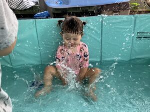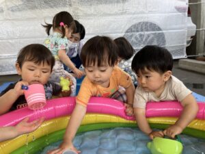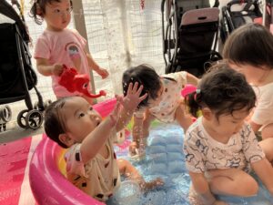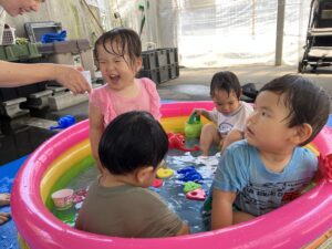 朝に保育者が水遊びの準備をしていると「今日水遊びするの⁉♡」と目を輝かせて聞いていた子どもたち。