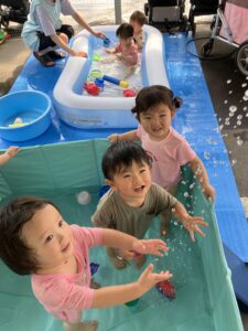 朝に保育者が水遊びの準備をしていると「今日水遊びするの⁉♡」と目を輝かせて聞いていた子どもたち。