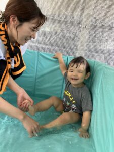 水遊びを始めたばかりの頃は水を怖がって泣いていたお友だちも、後半になると慣れてきて笑顔を見せ、顏に水がかかっても泣かずに楽しめるようになっていました。