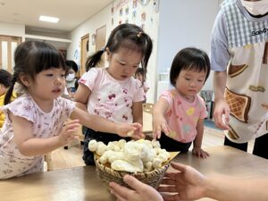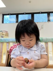保育者に「切ったり、お料理に入るとにおいがするのんだよ」と言われると「え!すご!」と驚いた表情でした(^▽^)