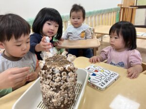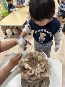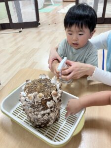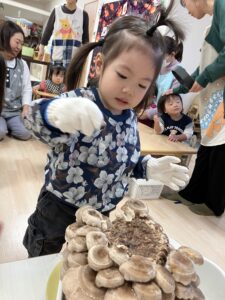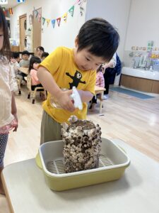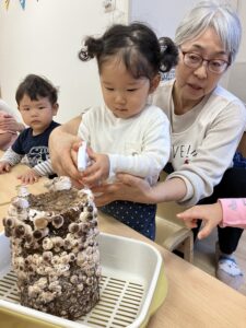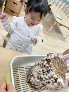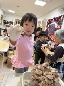 旬のきのこが、保育園の中で、毎日ぐんぐん育っていく様子を観察し、その変化に、自然の神秘や、命の不思議をちょっぴり感じながら、お家へのお土産きのこを楽しみにバックにしまっていました。