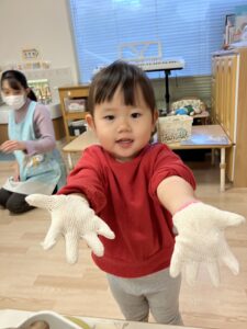 シメジみたいだった、シイタケのあかちゃんは、無事かさが開いて、みんなできのこ狩りを楽しみました。ちっちゃな軍手をして準備OK!!