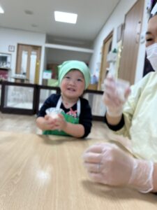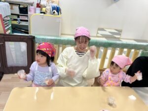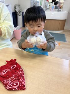 あいうえおにぎり♪のうたに合わせて、カップにいれたご飯をふりふりしておにぎりをつくりました。