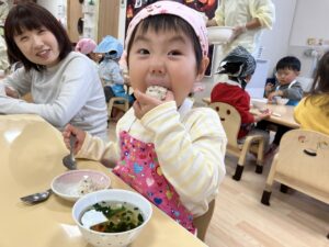おにぎりをお皿に分けて、先ほど味わったシイタケとカツオの出汁をお汁に入れて、“いっただっきまーす!!”をしました。