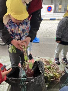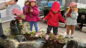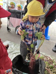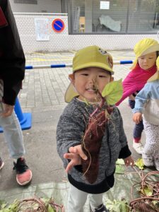 朝の会から「大きいおいもあるかな?」「いっぱい掘りたい!」とワクワクした声があがり、さくらっこガレージの簡易畑へ!!(笑)