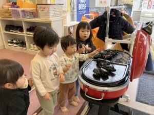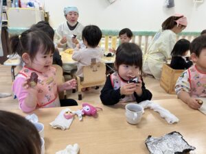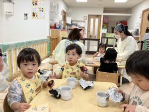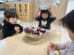 お芋パーティ、楽しみだね!!お芋掘りの絵本やお歌に親しみ、焼き芋パーティを楽しむさくらっこさんたち。