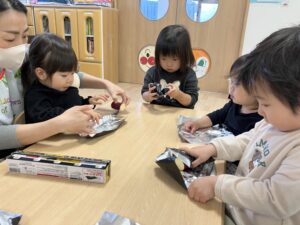 まずは、さつまいもをアルミホイルに包むお手伝いをしてもらいました。