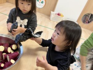 ぱんだグループのお当番さんが、焼き芋をさくらっこさんたちに配ってくれました!!