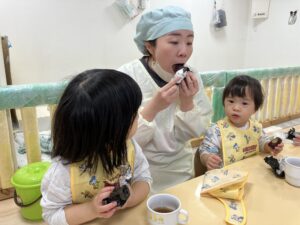 美味しい!!!保育者も一緒に、秋の恵みを味わいました。あったかい焼き芋をみんなで食べて、わくわく、笑顔あふれる焼き芋パーティになりました。