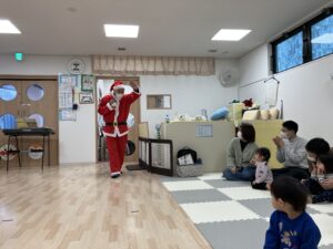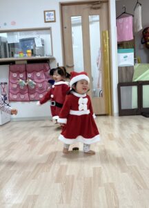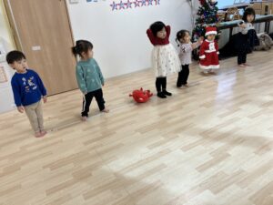タンバリンや鈴・マラカスを持って、♪サンタが街にやってくる・あわてんぼうのサンタクロース・おもちゃのチャチャチャ♪の歌をメドレーでの合奏から始まり、♪ピカピカブー・サンサン体操・ハッピージャムジャム♪のダンスをしました。