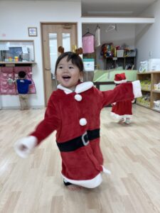 タンバリンや鈴・マラカスを持って、♪サンタが街にやってくる・あわてんぼうのサンタクロース・おもちゃのチャチャチャ♪の歌をメドレーでの合奏から始まり、♪ピカピカブー・サンサン体操・ハッピージャムジャム♪のダンスをしました。