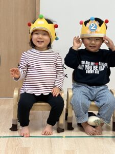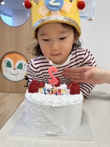 楽しみにしていたケーキは、箱の中にあるうちから嬉しそうに覗き込む二人!ろうそくを吹き消すのは難しそうでしたが、消えるまで何度もトライ!火か消えると嬉しそうにしていましたよ。