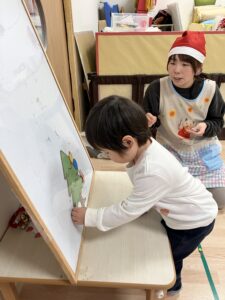 最後は保育者からのお楽しみのプレゼント。クリスマスツリーに皆で飾り付けをすると、トナカイの鈴の音が♪お誕生日の二人がサンタさんの登場を手伝ってくれ、楽しんだクリスマス誕生会となりました☆
