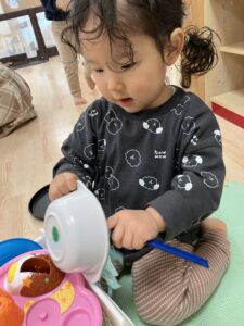 大掃除の前に掃除用具の名前を確認。以前名前を伝えていたはたきを見せてお名前クイズ。「はたけ!」と、元気に答える姿がとても可愛く、思わず笑顔に♡