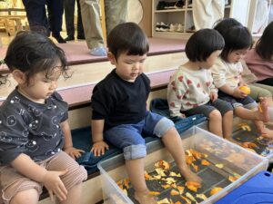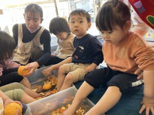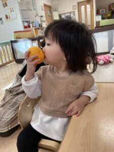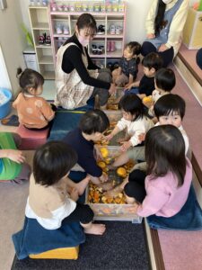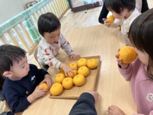 大掃除の後はゆず湯。先ずはゆずを皆で触ったり匂いを嗅いだり…「いい匂いだね」と嬉しそうに触っていました♪