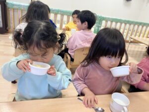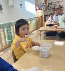 そしてこの日のおやつはいもきんとんでした♡「あまーいにおいだね♡」
