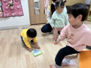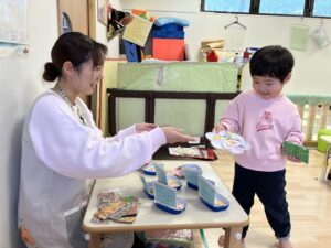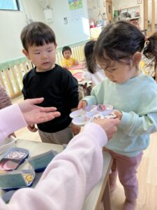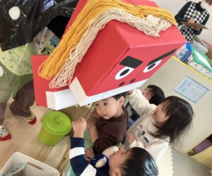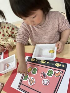 おせち料理屋さんごっこでは「くりきんとんはお金がたくさんになりますよーにだよね?」と、おせち料理の意味を覚えていて教えてくれたぱんだグループさん!」さすがです!保育者がおせちの絵本でおせちの意味をお話していたのをしっかり覚えていたようです(^▽^)