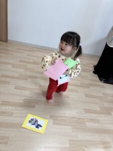 羽付きあそびではオリジナルの羽子板を作りました。完成すると「できた~!!!」と嬉しそうに保育者にみせる子ども達。保育者に「写真撮って~」と言って撮ってもらうのが嬉しいようです♡