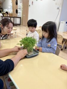 お豆から根っこや茎や葉っぱが生えている様子をみんなで観察して、みんなが大きくなる“栄養”のお話をしました。