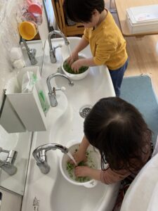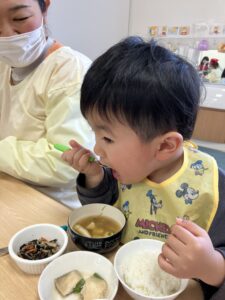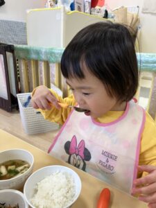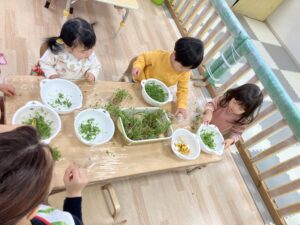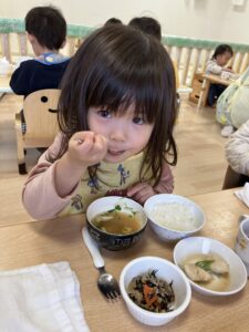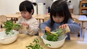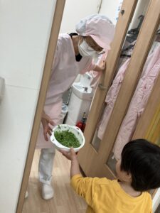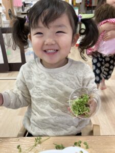 いつもはお肉やお魚から食べるさくらっこさんたちですが・・・自分達でお手伝いした豆苗をお味噌汁の中から探して沢山食べてくれました。「おいしいね~」自分たちでお手伝いした豆苗はどんな味がしたかな??