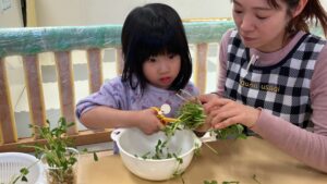 ぱんだグループさんは、ハサミを使って、豆苗を切るお手伝いをしてくれました。