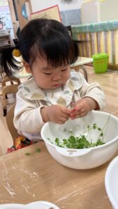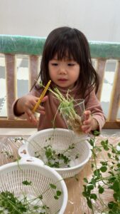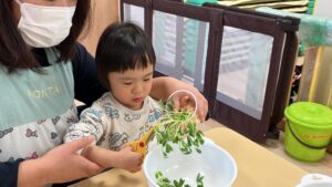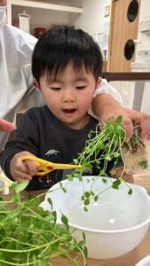 はさみの向きや豆苗の量の加減がちょっぴり難しい豆苗ちょきちょきでしたが、1回1回工夫しながら集中してチャレンジしてくれました。