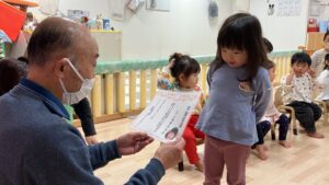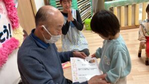 お別れ会では園長先生に卒園賞証書をもらいました。お名前を呼ばれると前に出て、かっこよく証書をもらう卒園生★