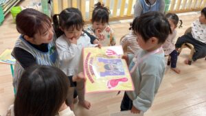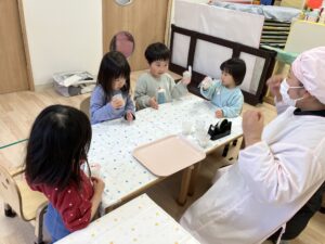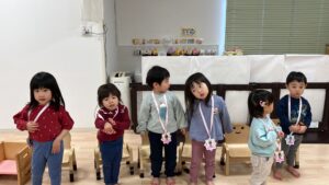 さくらっこではぱんだグループさんはお当番活動をしています♪今日も「○○がするー」と言ってみんなの前に立ち、メニューをはっぴょうし、お給食のお歌を歌ってくれました◎