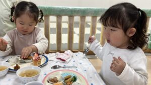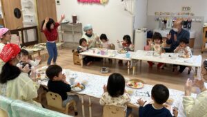 みんなでお顔をみてたべました。また、保育者や給食の先生も一緒にたべましたよ(^▽^)