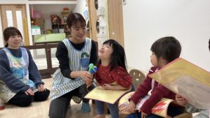 また、さくらっこ保育園で楽しかったことを聞いてみると、おやつが美味しかった、アンパンマンブロックがたのしかった等たくさんこたえてくれました!ぱんだグループさんのご希望により、マイクは三本つかって記者会見スタイルです(笑)