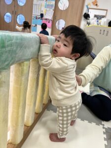 つかまり立ちして、お友だちの様子を観察中です!お友だちが遊んでいる様子が気になるようです(^▽^)