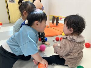 そこでぱんだ(2歳)グループさんに「○○ちゃんが一緒にあそびたいみたいだよ~」と声をかけると「いいよ~♪」と言ってコアラグループさんのお部屋に♪