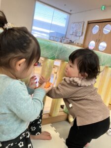 ぱんだぐるーぷさんには遊ぶ前に「新しいお友だちびっくりしちゃうから優しい声でお話してあげてね」と伝えるとしっかり優しくお話してあげていて、さすがです!!