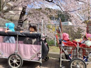 お散歩先でもシートに一緒に座ってなかよしさんです!