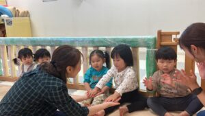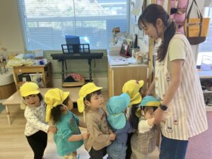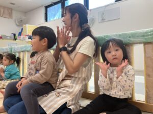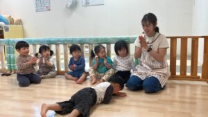 リトミックでは講師の方が絵本などを題材に表現遊びを楽しむことができるように工夫してくださっています。
